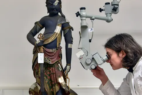Die Restaurator:innen unterstützen die Ausstellung und wissenschaftliche Erforschung der Sammlung durch das Studium von Materialien und Herstellungsweisen. Sie tragen so dazu bei, die Kenntnisse über die Zeugnisse materieller Kultur zu erweitern. Immer öfter arbeiten sie dabei mit Restaurator:innen aus den Herkunftsgesellschaften zusammen. Das Zusammenbringen unterschiedlichen Wissens ist ein wichtiger Teil der Erhaltung der Objekte.